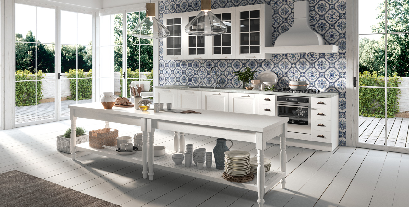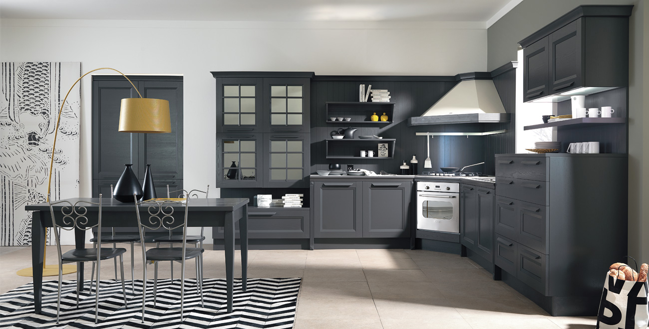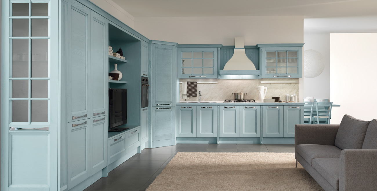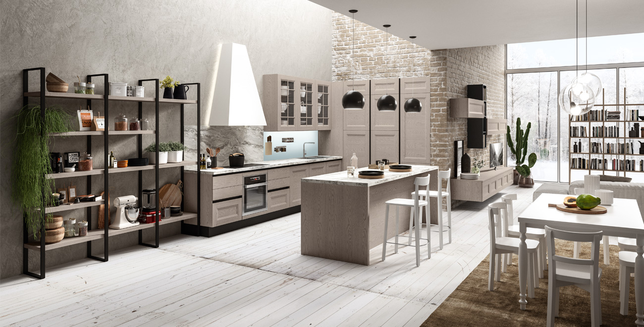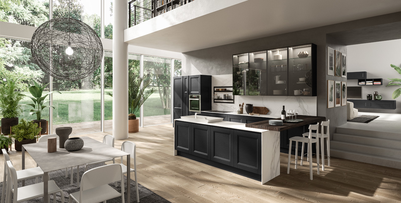 Adele is the model where tradition and modernity blend together until enhancing the kitchen environment with elegance and versatility. It also appeal to those who, though appreciating the essential lines, do not want to sacrifice the elegance of the classical elements, such as the frame. Equipped walls, living, double sided libraries are all the protagonists of an open space with elegant chromatic references that create warm atmospheres for a place which considers conviviality as the heart of the kitchen design.