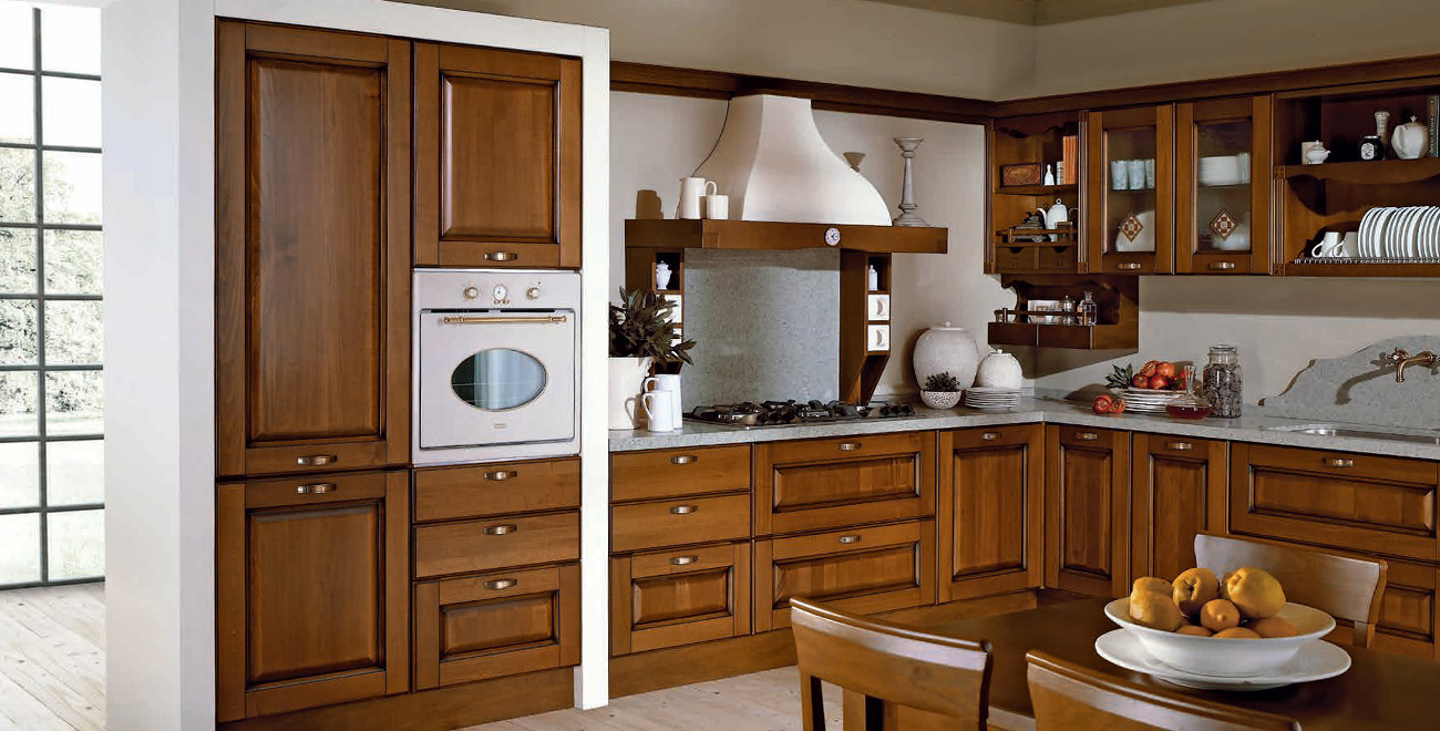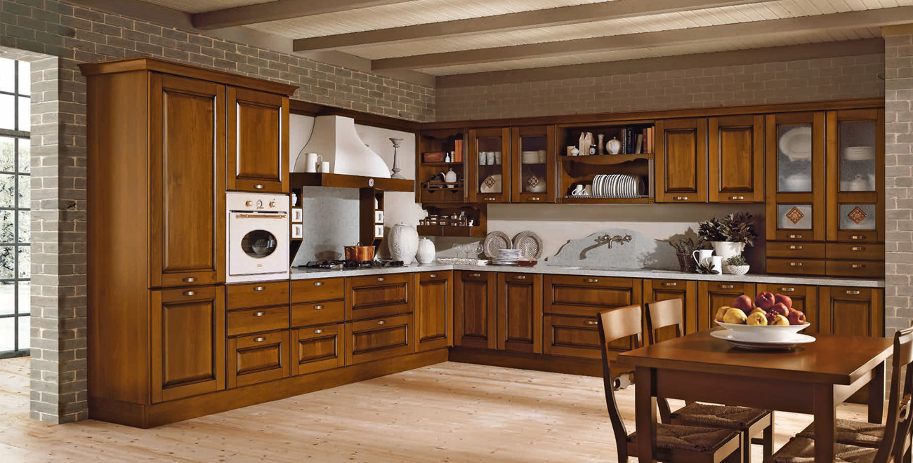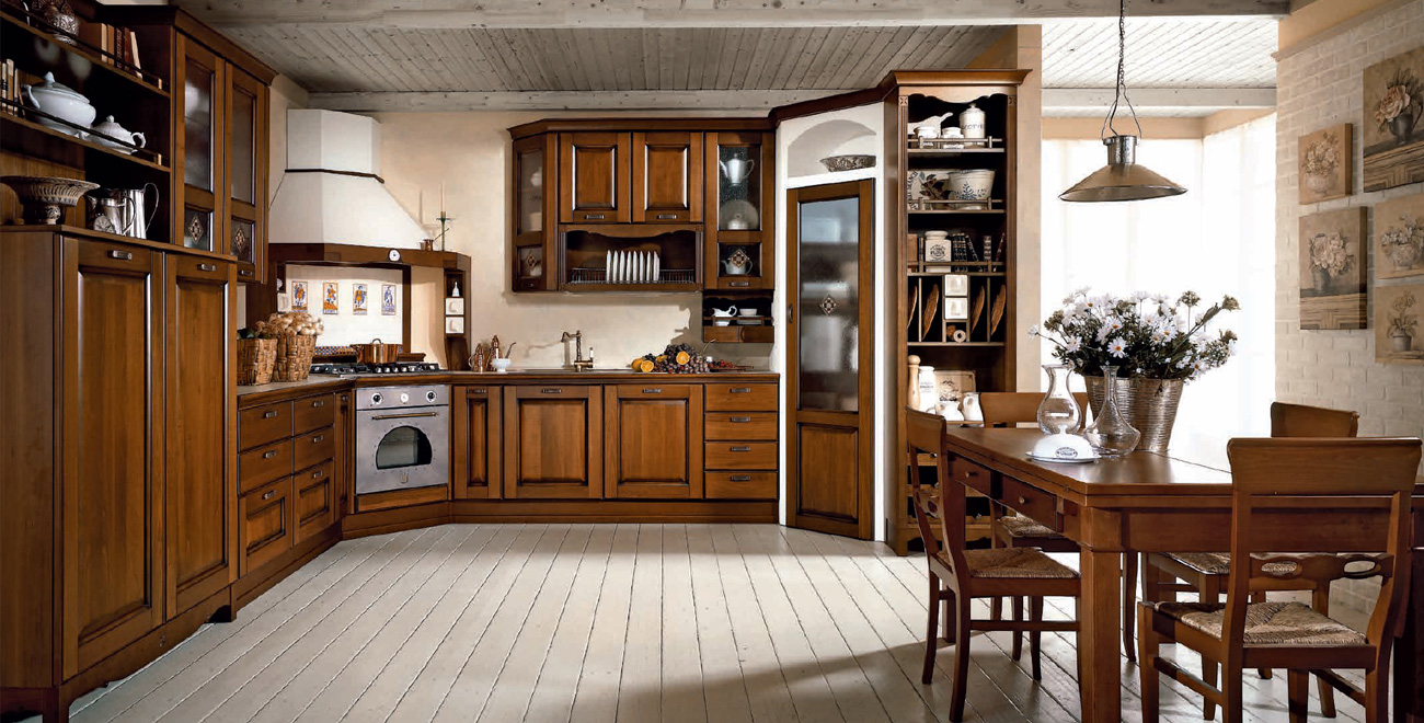 Thanks to the skillful balance of walls and volumes, Klassic interprets the space between the kitchen and the living room with a wide range of useful cabinets, storage elements and accessories which combine the practicality of everyday use with the beauty of the solid basswood, walnut finish with a light antique effect.