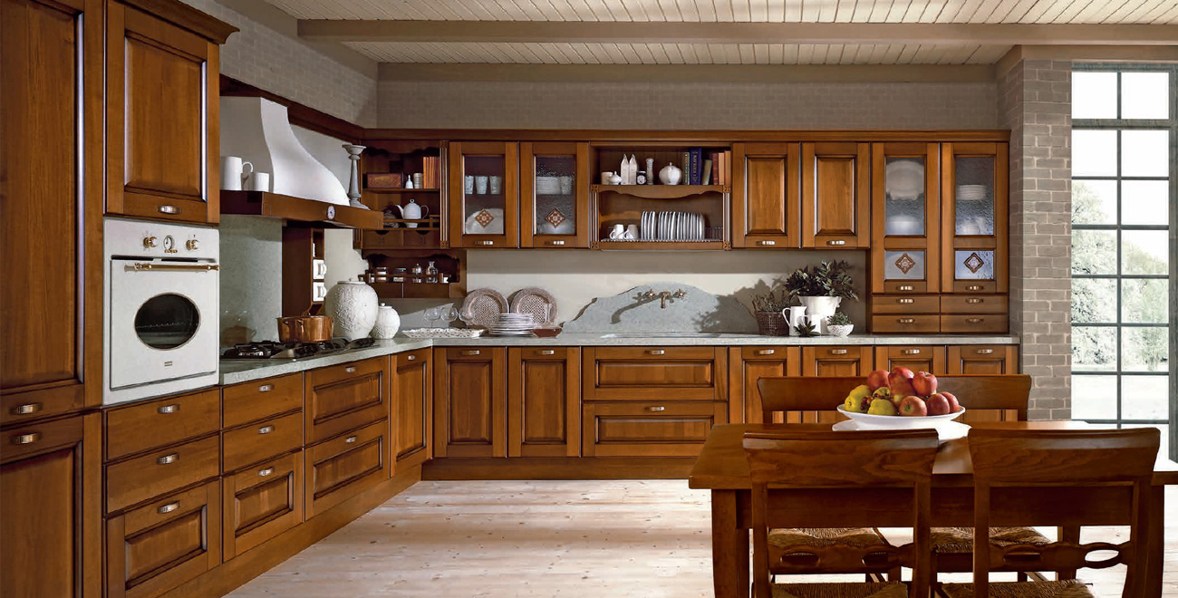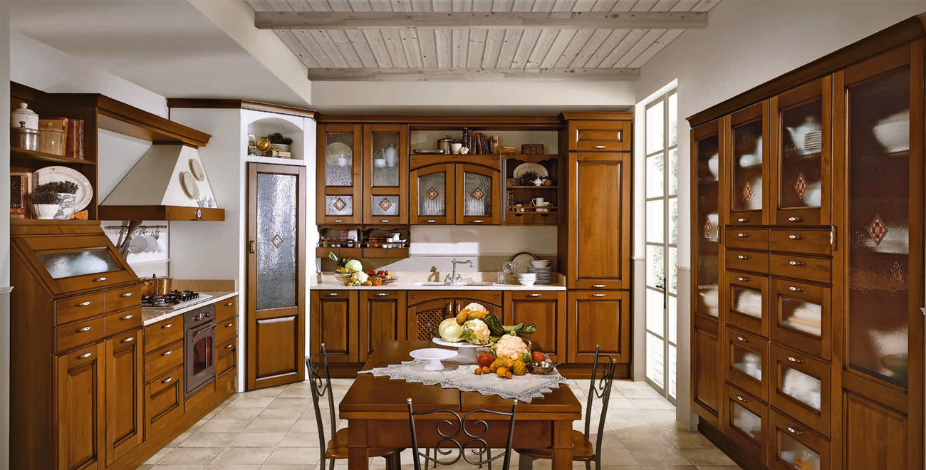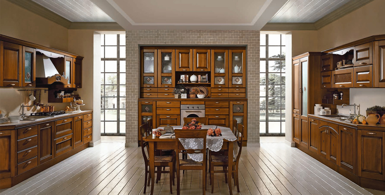 Klassic interprets the space between the kitchen. The sense of strength and the search of the detail are expressed by wooden worktops, the molten glass with a decorative shield in rilief and gold decorations, the three alternatives handles.